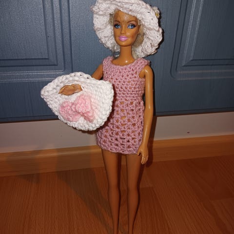 Sisältää virkatun mekon, huivin ja hiuspannan.