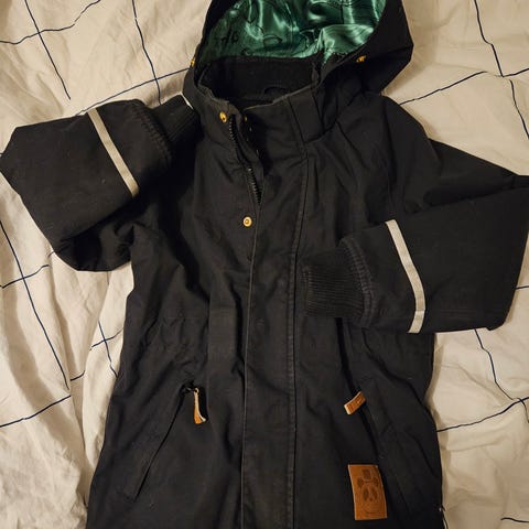 Minirodin toppatakki koossa 116-122cm. Siisti, mutta hihansuissa perus kulumaa ja pieni viilto saumassa, varmaab helppo korjata. Näkyy kuvissa.