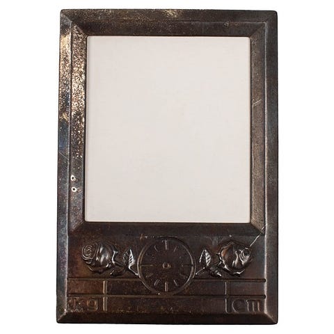 Kastekehys on valmistettu tummaksi patinoituneesta metallista, ja sen etupuolella on tila valokuvalle. Kehystä koristaa kohokuviointi, jossa esiintyy kaksi ruusua ja pyöreä mittataulu. Alareunassa on merkinnät "kg" ja "cm", jotka viittaavat lapsen syntymämittoihin.Takana tukijalka pöydällä pitämistä varten. Kehyksen etuosassa on koristeellisia kohokuvioita. Raskas patina ja tummuminen metallipinnassa.Leimat: Kultakeskus, 830, A9 (2002)Valmistaja: KULTAKESKUSMitat (LxK) ovat noin 7 x 10 cmVäri: tummanruskea/patinoitunutMateriaali: 830 hopeaseos