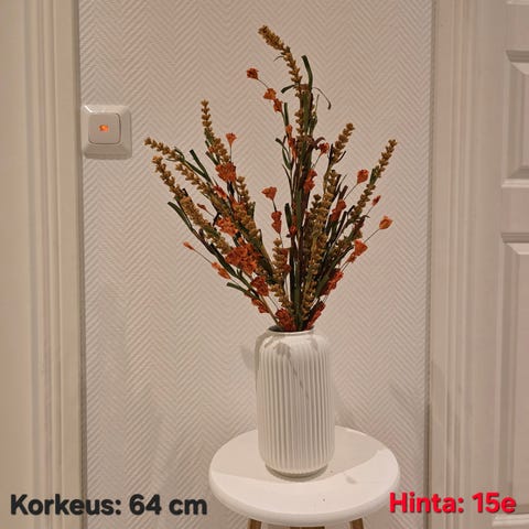 Myydään siisti ja tyylikäs tekokukka-asetelma kauniissa maljakossa. Ajattomat ja rauhalliset sävyt sopivat monenlaiseen sisustukseen. Ei vaadi hoitoa – helppo ja huoleton sisustuselementti.