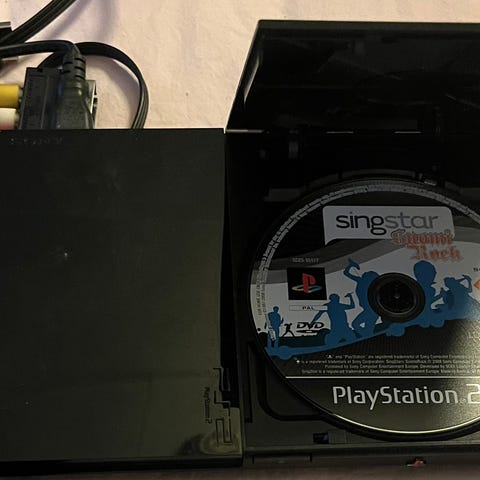 Playstation 2 pelikonsoli sisältäen 5x mikit, 2x ohjaimia, rattiohjaimen ja useita pelejä.