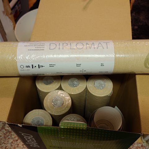 Kolme rullaa tähtikuvioista tapettia avaamattomissa rullissa.