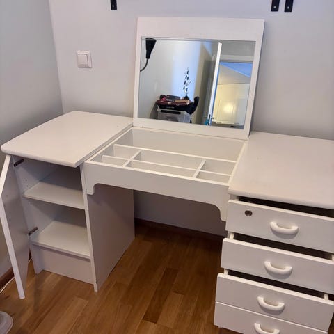 •Jonkin verran osumaa ottanut valkoinen meikki/työpöytä.