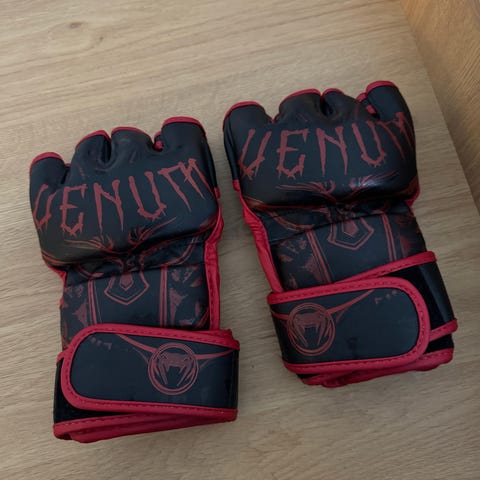 Vain kerran käytetyt Venumin vapaaotteluhanskat kokoa S. Ovat siis erinomaisessa kunnossa. Yhden pienen kulumakohdan pinnasta löysin (viimeinen kuva), on varmaan tullut säilytyksessä. Meillä asuu koiria.