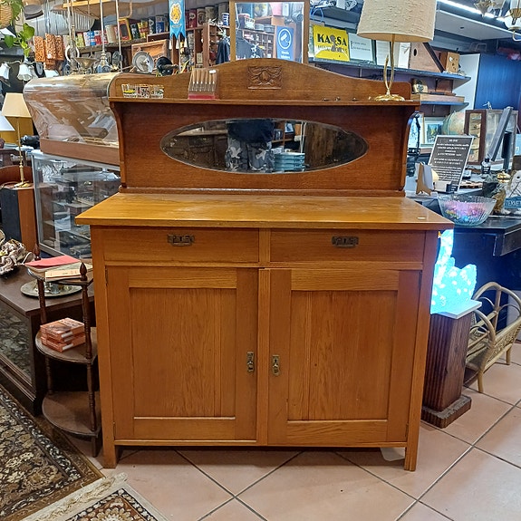 Tyylillä patinoitunut vanha kirjoituslipasto 1900-luvun ihan alusta. Rakenteellisesti on myös todella vankkaa tekoa, kaikki toimii vakuuttavan hienosti - laatikoissa lohenpyrstöliitokset. Klaffikannen alla on muutama ihan kohtuukokoinen vetolaatikko, yksi heistä on jopa lukollinen, tosin avainta siihen ei ole eikä sitä ole yritettykään etsiä. Mutta suuria aarrelöytöjä ei ko. laatikosta pääse tekemään sillä laatikko ei ole lukittu :)