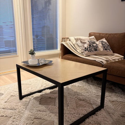 Myydään metallirunkoinen sohvapöytä. Koko 75 x 115cm, korkeus 45cm. Musta metallirunko. Pientä käytön jälkeä mm. kulmissa, mutta yleisilme siisti
