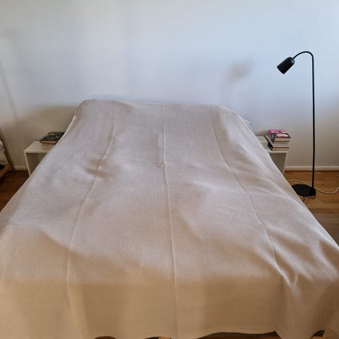 Päiväpeitto valkoinen kiiltävä värinen kaks kappaletta löytynyt yks kappale hinta 40€