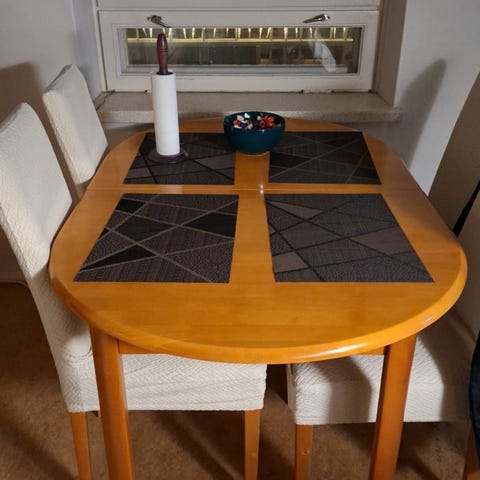 Vankkaa tekoa. 4 tuolia. Pöydän pinnassa käytön jälkiä. Pöytä jatkettava.