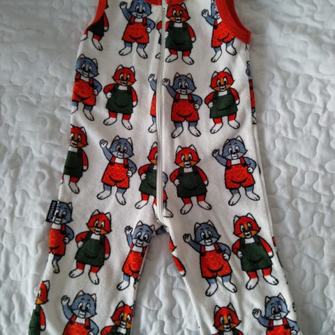 Ihana ja rakastettu Metsolan collegehaalari. Reilu mitoitus; resorit pidentää käyttöikää ja meillä meni vielä 74 vaatteiden kanssa. Harjattu pehmoinen sisäpinta. Pienen pieni haalea tahra toisessa polvessa(kuva), sekoittuu kuosiin ja ei ole häiritsevä. Muutoin tosi siisti.