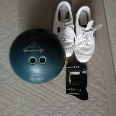 Vetolaukku 2 pallolle, pallot n. 7kg, kengät (koko 43), kahdet rannetuet, pesuneste.