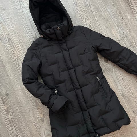Naisten pitkä, mattapintainen untuvatakki. Koossa S rinnanympärys n. 104cm, vyötärö n. 98cm, pituus niskasta helmaan n. 95cm, kainalo-hihansuu n. 54cm.