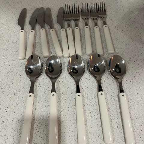 Hackman Hackminna aterimet, joissa on harmaat muovikahvat. Setti sisältää erilaisia ruokailuvälineitä: 3 kpl veitsiä, 1 kpl haarukoita, 3 kpl ruokalusikoita, sekä 3 kpl pikku lusikkaa. Materiaalina ruostumaton teräs ja muovi. Aterimissa käytön jälkiä. Hinta yhteensä.