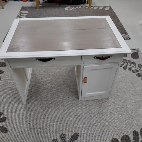 Vanha työpöytä. Pöytälevy joskus entisöity. Säilytetty lämpimässä.
