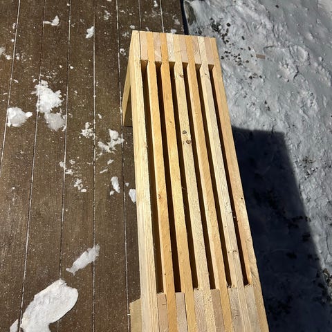 Puinen, tukeva penkki. 178 cm pitkä, 41,5 cm leveä. Nouto käteinen