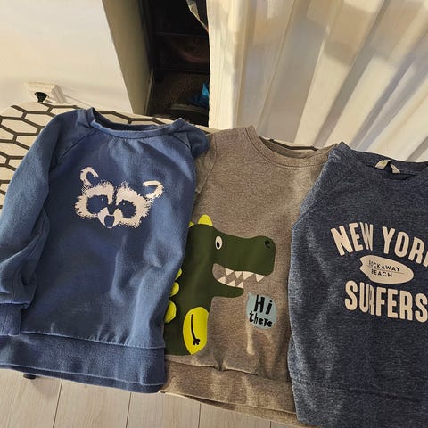 Collegepaitasetti koossa 92-98. Merkkeinä ylhäältä alas H&M, Metsola ja Adidas.