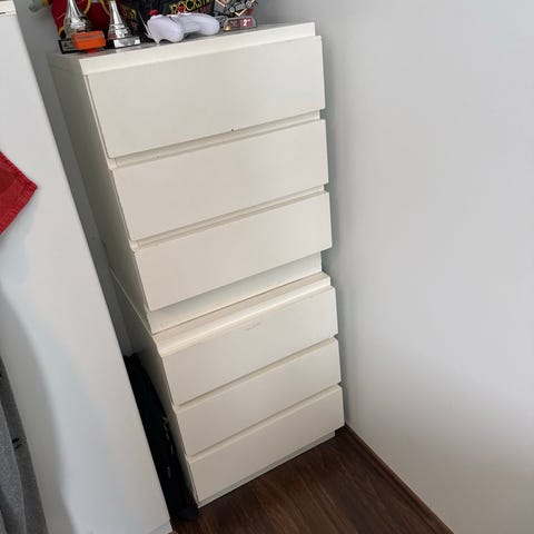 Valkoinen lipasto viidellä laatikolla. Taloudessa ei ole eläimiä.