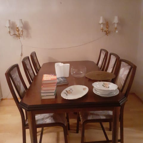 Myydään kuvan pöytä ja tuolit.Pöydän päällä lasi.Muutama naarmu löytyy.