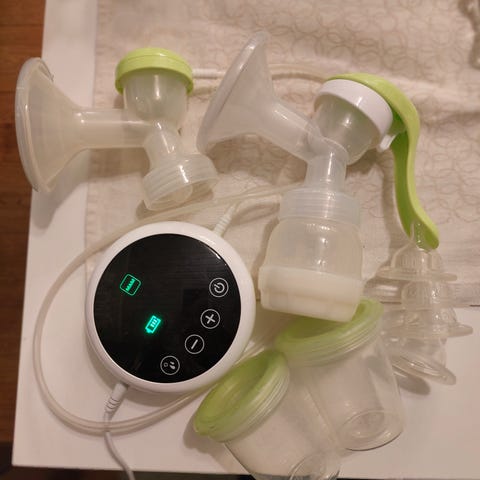 Mamin rintapumppu setti, manuaalinen / käsikäyttöinen ja sähköinen pumppaus. Ladattava akku eli pumppaus langattomasti onnistuu, kestää noin 2-3h yhdellä latauksella, toimii toki myös laturissa kiinni ollessaan. Stimulaatioasetus jolla maito saadaan herumaan, ja 9 eri tehoa pumppaukseen. Näyttää myös kätevästi pumppaukseen kuluneen ajan.