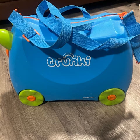 Ihana legendaarinen Trunki - perässä vedettävä matkalaukku lapselle, jonka päällä taapero voi istua.