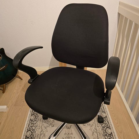 Musta toimistotuoli, hyväkuntoinen ja siisti. Saa säädettyä ylös ja alas, myös kallistusta pystyy säätämään.