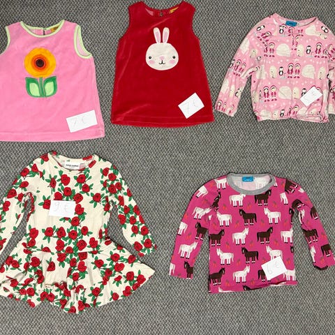 Riippuen tietty lapsen koosta ja vuodenajasta niin tässä luultavasti kaikki vaatteet mitä tulee tarviimaan. Meille tuli kesävauva. Kolmessa isossa pahvilaatikossa kaikki mahdolliset, unipussit, ulkovaatteet, kenkiä useita, ja sisävaatteita. On muumia ja joitain merkkivaatteita mutta pääasiassa ihan tavallisia kivannäköisiä vaatteita. En jaksa kuvata koska niitä on niin paljon, jos on tosi tarkoituksella kiinnostunut niin saa tulla itse silmäilemään.