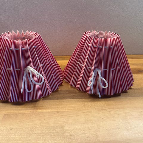 Ylimääräisiksi jääneet, tilaustuotteina valmistetut kauniit lampunvarjostimet. Kaksi isompaa varjostinta (halkaisijat 43/33 cm, korkeus 34 cm), tuskin havaittavat kuljetusvauriot pinnassa kuten kuvissa, ja yksi pienempi (halkaisijat 33/20,5 cm, korkeus 25 cm), prima kunto, vielä paketissa. Tarvitsevat pöytävalaisimen jalat ja jonkinlaisen kiinnityksen jalkoihin. Kuvissa kiinnitysesimerkit. Koko paketin hinta 50€, isommat yhdessä 30€, erikseen 20€/kpl ja pienempi 20€/kpl. Haku Puistokatu 4, Ullanlinna, Helsinki.