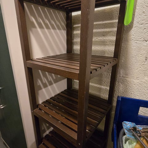 Kuvan mukaisia hyväkuntoisia hyllyjä jouten. Yksi vetolaatikollinen hylly puuttuu kuvasta.