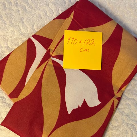 Käyttämättömät. Toinen on pesty ja silitetty, kutistui vähän pesussa, mitta nyt 130x31 cm. Pesemättömän mitta 135x34 cm. Hinta 4€/liina.