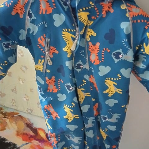 Toppapuku ja siihen sopiva kauluri. "Korvahattu" on veikeä ja lämmin. Kauluri (flease) on lapselle kaulaliinaa helpomi. Lapaset ovat itse neulotut - uudet.