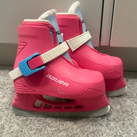Bauer lasten luistimet koko 25/26 väriltään pinkit. Käytönjälkiä ja oikean luistimen solki on toisesta reunasta irti. Luistinta voi käyttää, mutta luistinten kiinni saanti/avaus on vähän vaikeampaa. Menee kyllä, mutta ei niin sujuvasti eikä vaikuta luisteluun, kun kiristyy kyllä. Kunto voisi olla myös vaatii korjausta jos tuon kulman haluaa liimata.