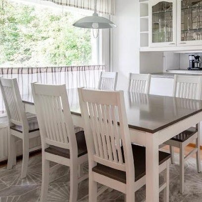 Kuuden hengen ruokapöytä hyvässä kunnossa + tuolit, jotka ollut käytössä noin vuoden verran.