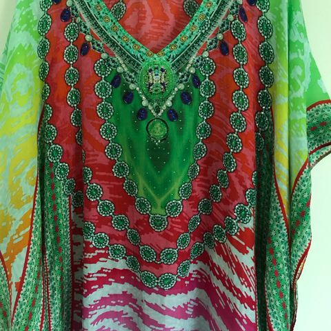 Musta, kultakirjailtu kaftaani, 100 % silkkiä. Pituus 140 cm.