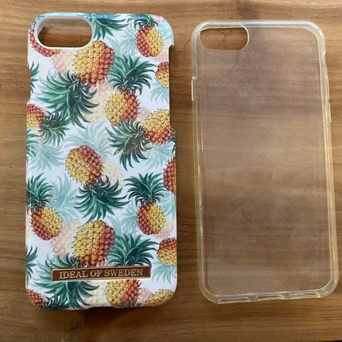 Puhelimenkuoret iphone 7/8/SE, avokado-kuvioiset ja kuviottomat läpinäkyvät. Kuoret ovat ehjät, mutta käytön jälkiä näkyvissä.