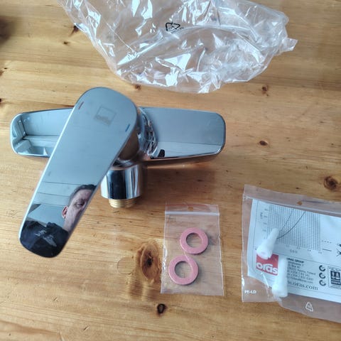 Musta kylpyhuoneen hana, jossa on mukana asennustarvikkeet ja asennusohjeet. Korkeus 85cm