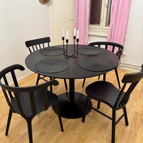 Pöydän päädyssä laatikko, jonka yhteydessä leikkuualusta. Pöytää voi pidentää 45cm, jolle oma paikka pöydän alla. (170+45=215). Puukannen voi tarvittaessa hio ja käsitellä mieleisekseen. Ei kotiteläin talous.