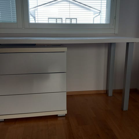 Valkoisella rungolla ja mustalla oleva työpöytä. Pöydässä edessä katsottuna oikeassa reunassa lipasto kahdella laatikolla.