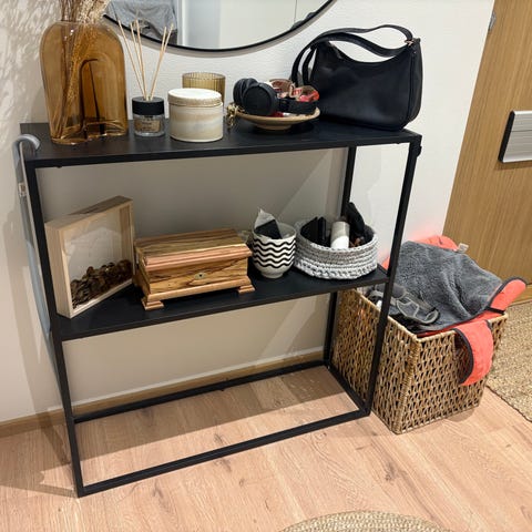 Hyvässä kunnossa. Hylly on mustalla puukuvioinnilla ja vakaa.