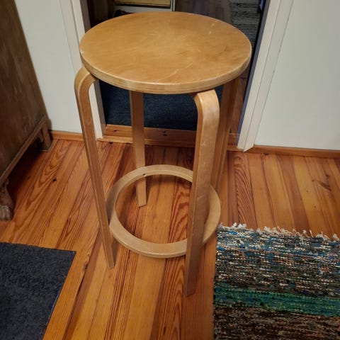Myydään Alvar Aallon baarijakkara 64, koivu, lakattu luonnonvärinen, istuimen pinta musta linoleumi. Jakkaran korkeus 65 cm.