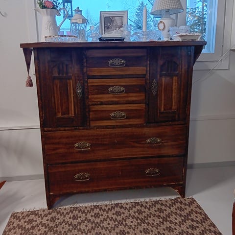 Mitat: klaffipiir kork 100, lev 72. Vitriini kork 84, syv 20. Yläosa lähtee irti. Avain tallessa. Sivussa halkeama, joka huomioitu hinnassa.