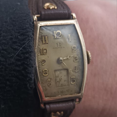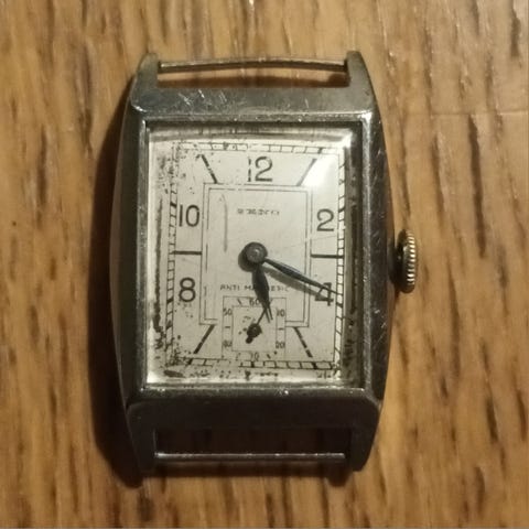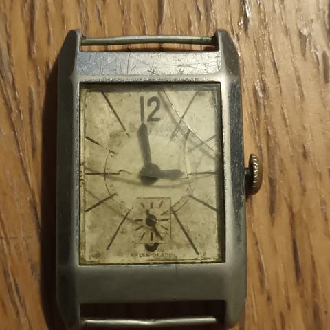 Vanha kaiverruksen perusteella 2.maailmansodan Natsi-Saksan aikainen tank-mallinen Art deco tyylinen Para vetokello. Made in Germany. Iästä huolimatta käy ja jopa pitää aikaa silmämääräisesti parin tunnin seurannalla. Koko 22mm kruunulla ja lug to lug 38mm. Lugiväli 17mm. Nouto Turusta tai postikulut ostajalle.