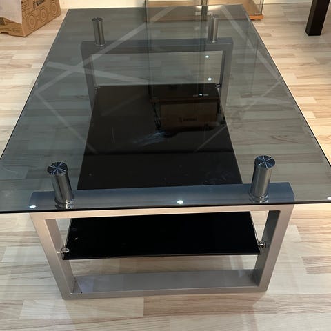 Sohvapöytä metallirungolla ja lasilevyllä. Minimalistinen metallin ja lasin yhdistelmä tekee ilmeestä hienostuneen ja modernin.
