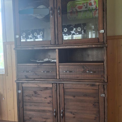 Vintage tammen värinen vitriini, mustalla kannella ja jaloilla. Ovissa kirkkaat lasit ja push open mekanismit.