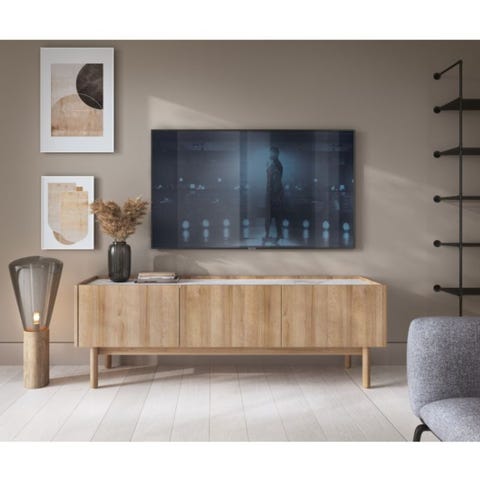 Tyylikäs tammen värinen Bohox-senkki, jonka kaunis kansi on valkoista marmorijäljitelmälevyä.Senkki sisältää kolme kaappia, joissa jokaisessa on välihylly.