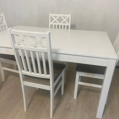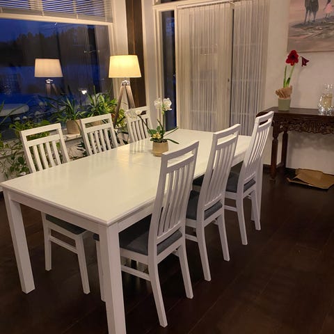 Myydään MONA-ruokailuryhmä valkoinen–harmaa -värissä. Ruokailuryhmä on laadukas, Pohjanmaan Kalusteen valmistama tuote.