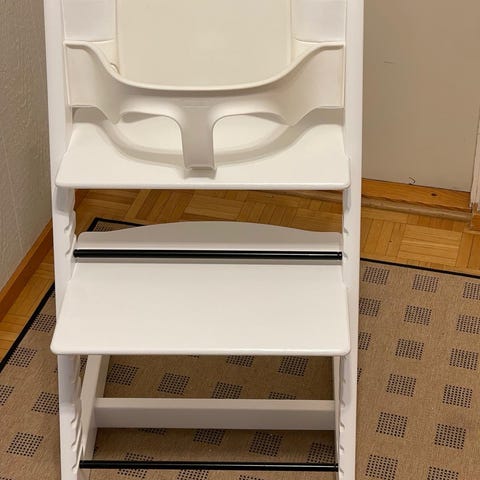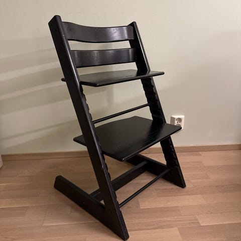 Stokke Tripp Trapp säädettävä lastentuoli, musta väri. Tuolissa on säädettävät istuin- ja jalkatuet, jotka mahdollistavat lapsen istumisen eri ikävaiheissa. Materiaali kestävää ja helppohoitoista. Tuolissa näkyy ylhäällä vähän käytön jälkiä, kuten naarmuja ja kulumaa. Muuten siisti ja hyväkuntoinen