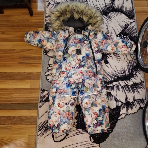 Päiväunia vielä ulkona nukkuvalle tämä oli huippu, koska käden- ja jalansuut saa taiteltua kiinni. Sitten ulkoillessa jo kävelevälle puku toimii normaalina toppapukuna. Haalari kaikin puolin ehjä ja hyväkuntoinen. Vesipilari 15 000.