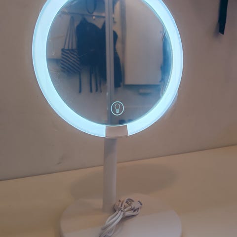 Uusi USB-ladattava meikkipeili valolla. Peilissa on kaksi puolta, toinen normaali ja toinen 5x suurentava. Kummallakin puolella kolme eri valon värin sävyä ja kussakin sävyssä portaaton kirkkauden säätö. Peilin halkaisija on 18,5cm. Peilin kulmaa voi säätää 360 astetta.