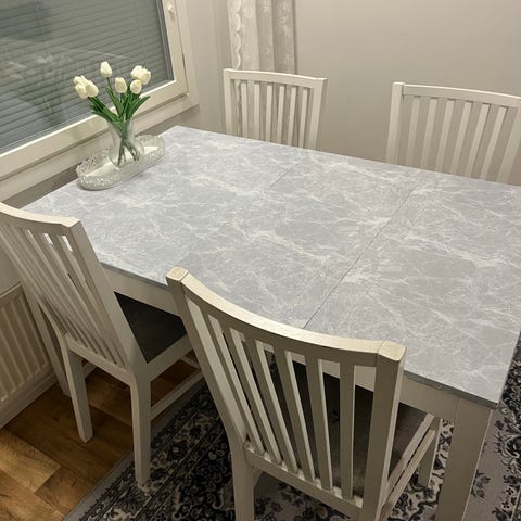 Kromatut metalli jalat ja 4cm paksu pöytälevy. Kunto muuten hyvä mutta pöytälevyssä muutama naarmu.