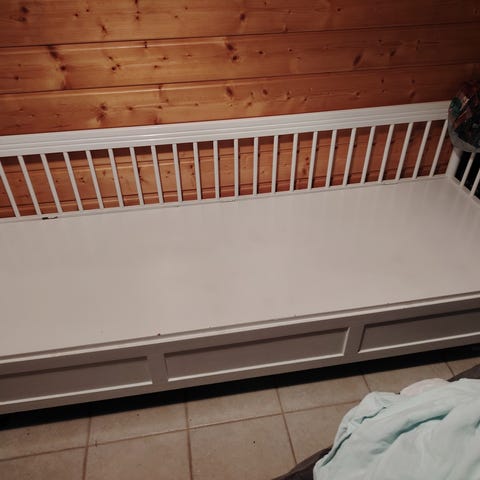 Kulahtanut sohva. Pehmeä istua. Hieman nuhraantunut ja kissan repimä.