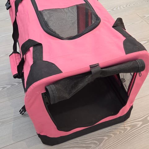 Kuljetuskoppa koiralle musta-harmaasta kankaasta. Kopassa on kantokahva ja useita verkkopaneeleita ilmanvaihtoa varten. Sisällä ohut patja, jossa pestävä pehmeä kangas (saa vetoketjulla irti). Siisti. Korkeus 43 cm, leveys 43 cm ja syvyys 60 cm. Yhtä kantokahvaa vähän järsitty (näkyy viimeisessä kuvassa), muuten hyvässä kunnossa. Nouto Simonkylästä.